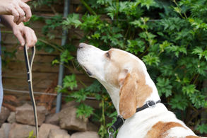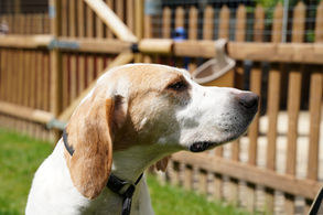Leon  ist ein  ruhiger, gelassener, sehr freundlicher, verschmuster Foxhound Rüde.
