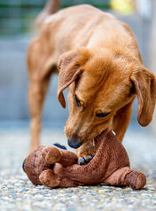 Sie spielen mit allen Hunden auch den großen, tragen Stofftiere oder andere Spielzeuge durch die Gegend.